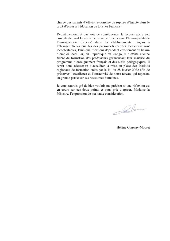 J’ai écrit le 13 juin à la ministre de l’Europe et des affaires étrangères, Catherine Colonna, à propos de l’extinction des contrats de résidents à recrutement différé.