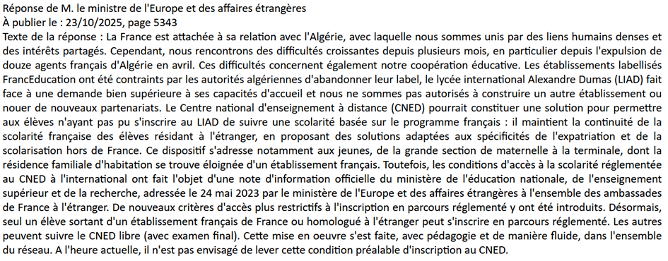 En juillet 2025, j’ai interrogé le ministre de l’Europe et des affaires étrangères, Jean-Noël Barrot, sur les difficultés d’accès à l’enseignement français pour les élèves français et binationaux en Algérie.