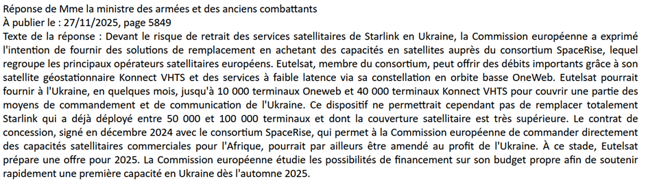 En juillet 2025, j’ai interrogé le ministre des armées de l’époque, Sébastien Lecornu, sur la poursuite du soutien de la France et de l’Union européenne à l’Ukraine. J’ai souhaité savoir combien coûterait et combien de temps prendrait une exploitation maximale des capacités de la constellation « One Web » au profit de l’Ukraine d’une part, et lequel des mécanismes financiers mis en place par l’Union européenne en appui à l’Ukraine pourrait être activé pour offrir au plus vite ladite capacité d’autre part.
