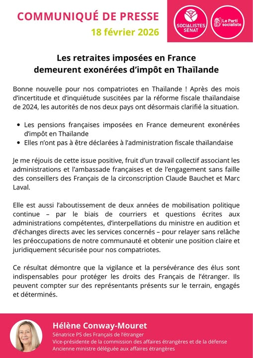 Après deux années de mobilisation continue avec les conseillers des Français de Thaïlande Marc Laval & Claude Bauchet auprès du Ministère de l’Économie, des Finances et de la Souveraineté industrielle, énergétique et numérique et avec le soutien de l’Ambassade de France en Thaïlande, bonne nouvelle pour les retraités français établis dans le pays qui demeureront exonérés de double imposition. Ce résultat démontre que la vigilance et la persévérance des élus sont indispensables pour protéger les droits des Français de l’étranger.